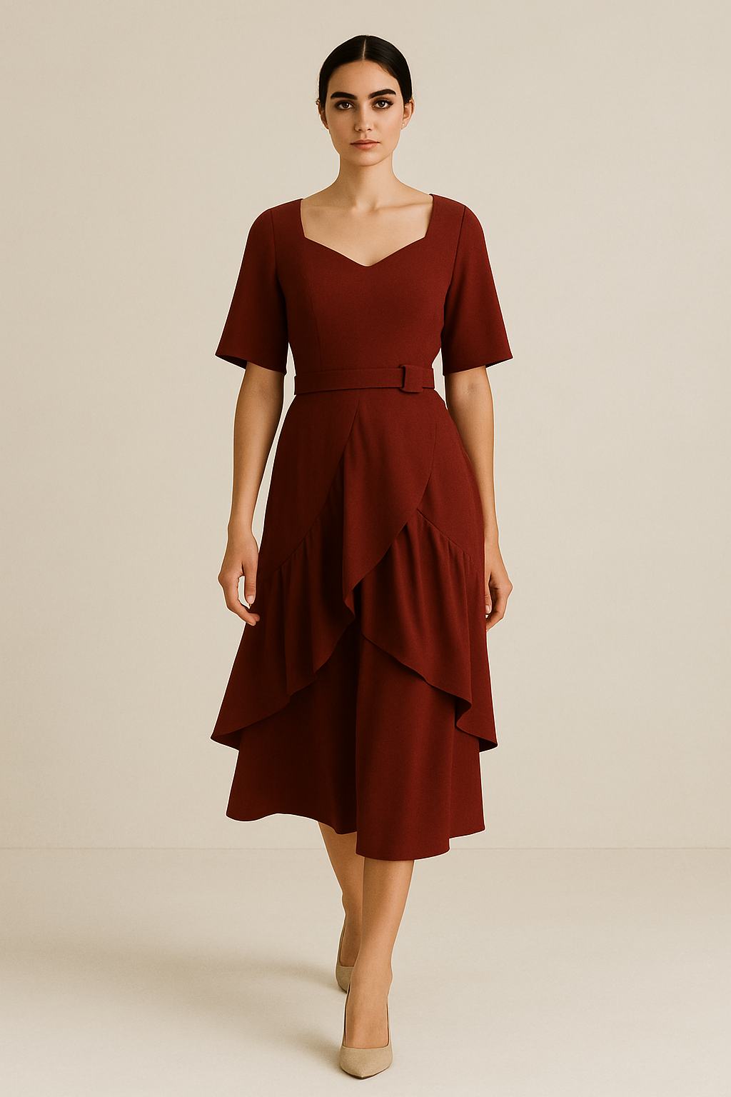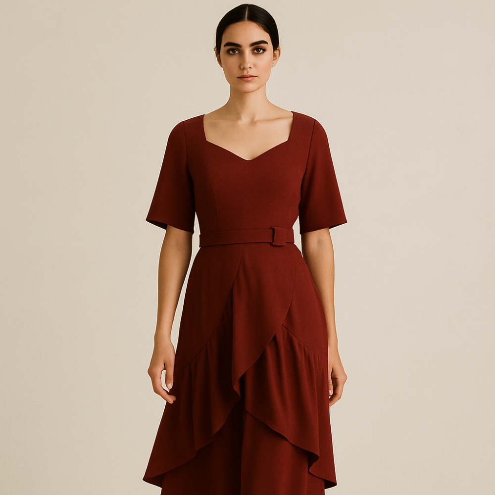 Embrace timeless elegance with our A-Line Midi Dress Maroon for Women. Designed with a rich maroon shade, this midi dress features a high neckline, short sleeves, and a dramatically ruffled skirt for movement and flair. The cinched waist enhances your silhouette, offering sophistication with comfort. Ideal for garden parties, evening dinners, or weekend outings. Pair with heels for formal occasions or sandals for casual charm. Available at Jhanvi Fashion