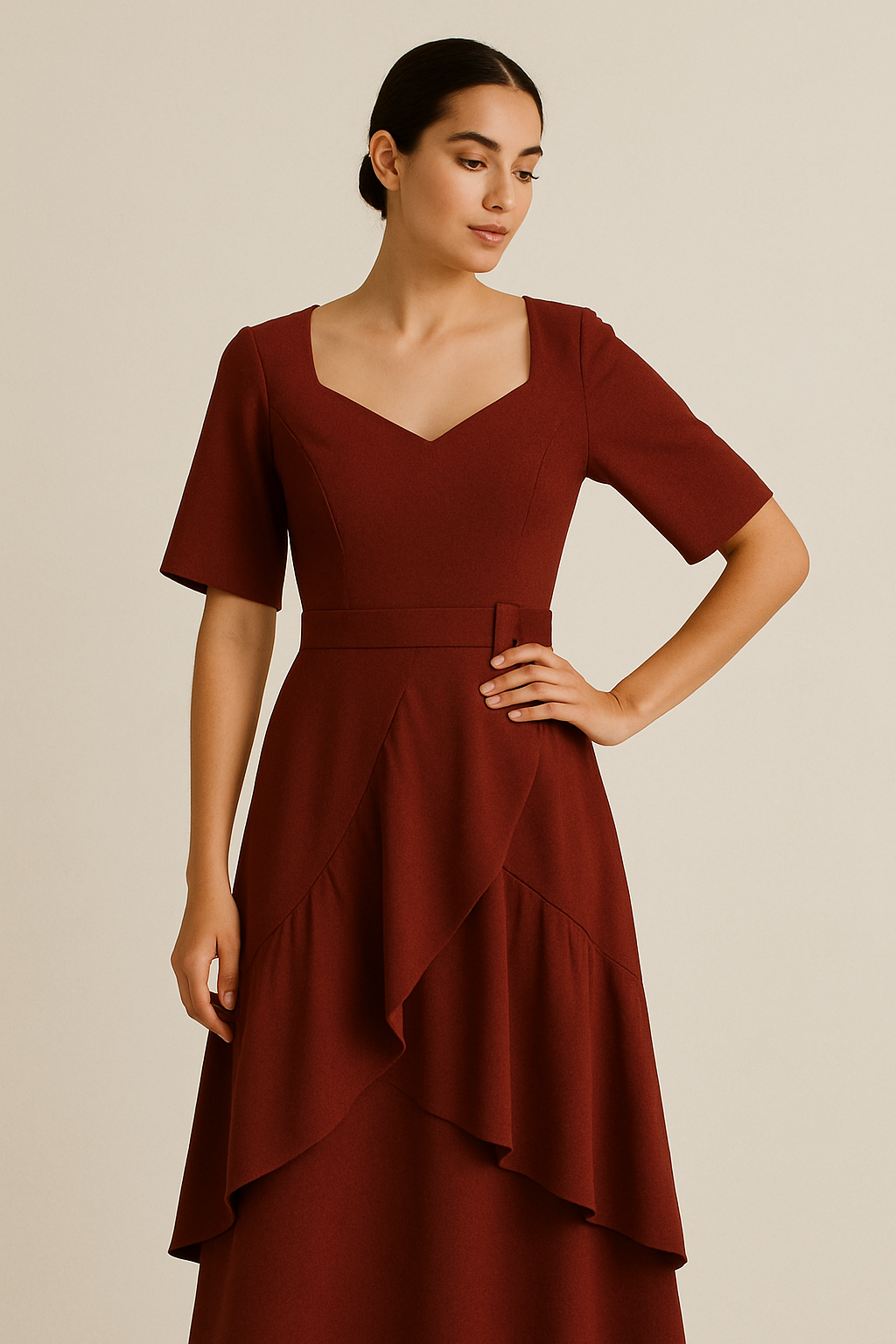 This dress is stunning! The maroon color is rich and classy, and the ruffled skirt adds such a beautiful flow when I walk. It fit perfectly at the waist very flattering