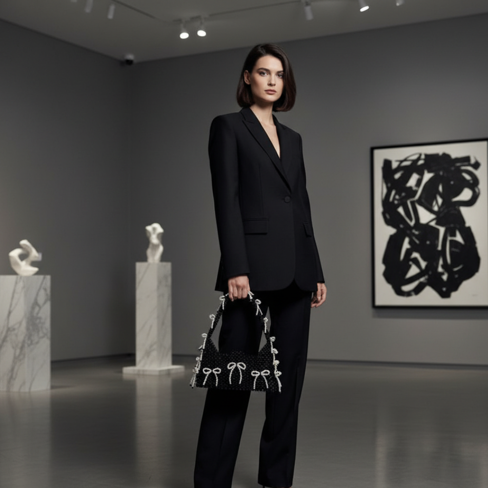 The Black Pearl Bow fashion designer declaration handbag is an inventive combination of formidable elegance and comfort craftsmanship. This lovely piece capabilities a deep black crystal frame quite extra with sensitive pearl bow detailing, giving it a royal and stylish look. The beadwork is cautiously handcrafted for a top class end that shows great luxury.