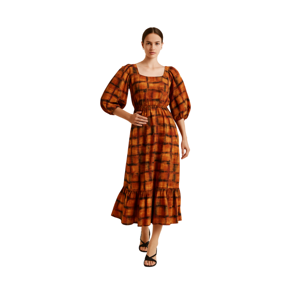 The colourful orange, brown, and blue Dress design adds a whimsical element, while the flowing silhouette and ruffled embellishments provide a comfortable and effortless appearance. The elastic waist provides a comfortable fit, and the three-quarter sleeves are versatile for any season. Whether you’re going to the beach, a concert, or simply hanging out, this outfit will make you appear elegant and free.