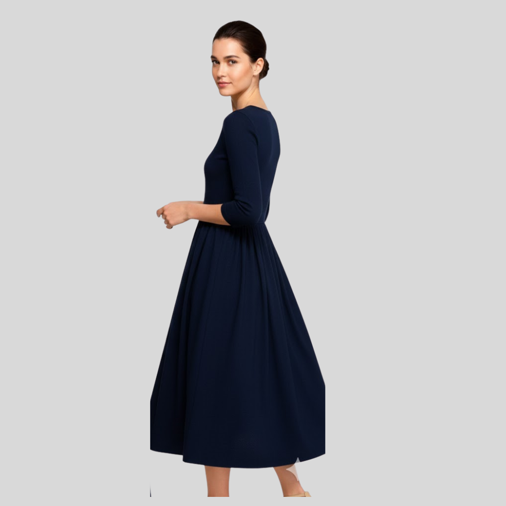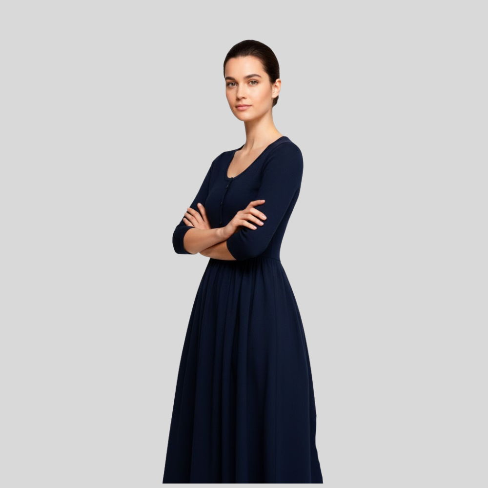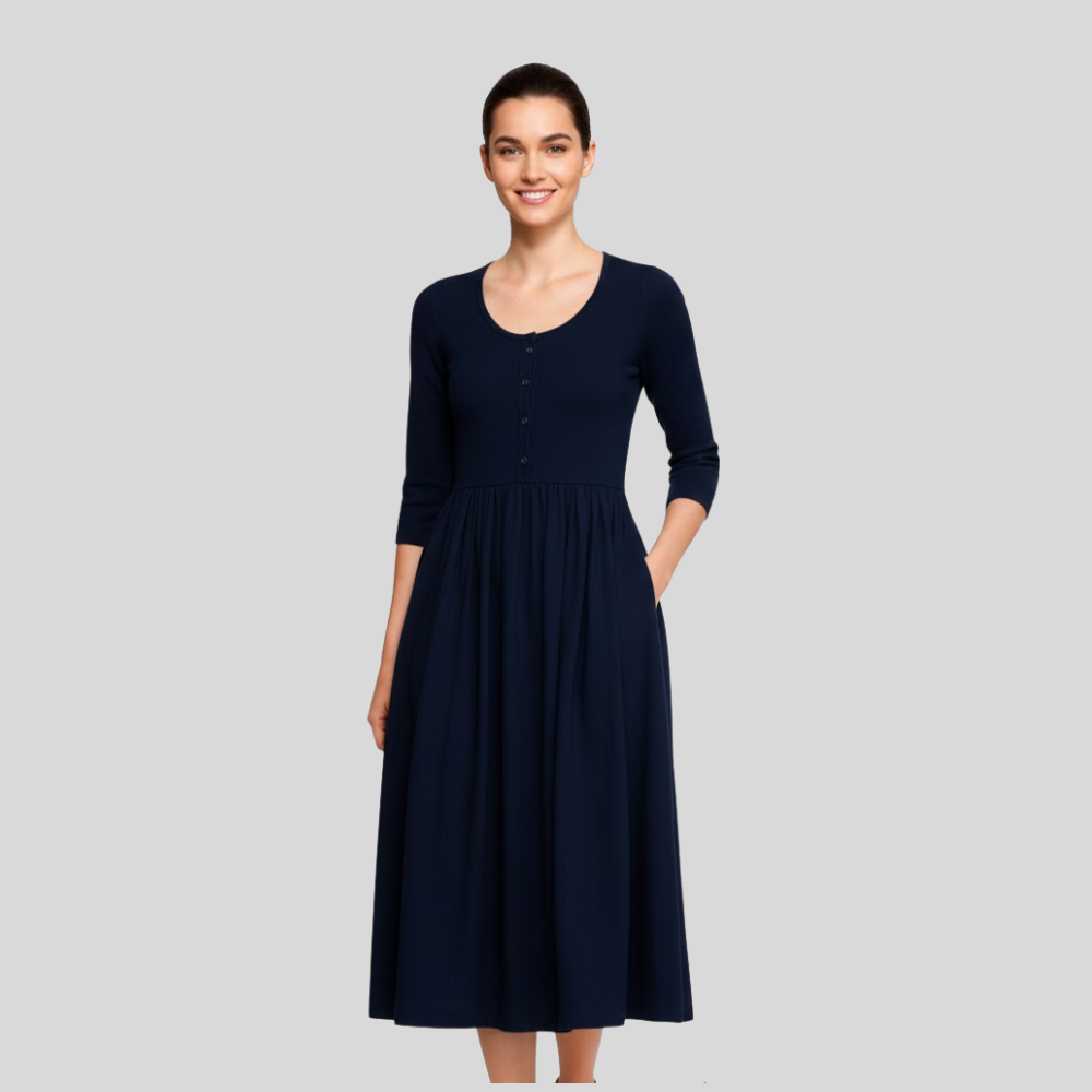 A Dress timeless piece exudes sophistication and is very feminine with deep blue; it’s versatility and elegance altogether. The button down on the front and the three-quarters sleeves create that perfect silhouette, great to wear during almost any season