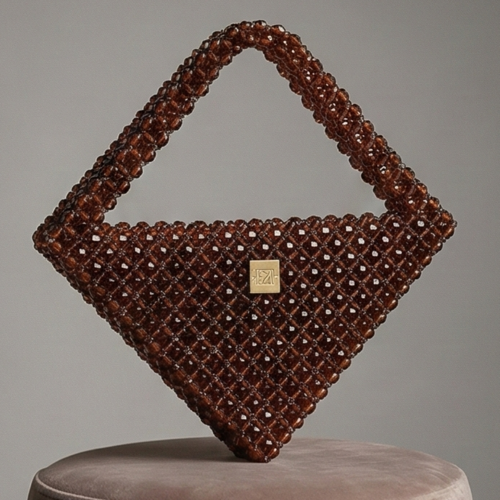 Step into the arena of current luxury with the Mocha Diamond Cut Crystal Beaded Handbag, a masterpiece crafted for women who love formidable shapes, rich tones, and avant-garde clothier style. This handbag sticks out at once with its specific inverted triangle silhouette, making it a real announcement piece which can remodel even the first-rate outfit right into a excessive-style appearance. The mocha brown faceted beads add intensity, shine, and texture—catching the moderate fantastically at the same time as giving the bag a warmth, pinnacle class glow.