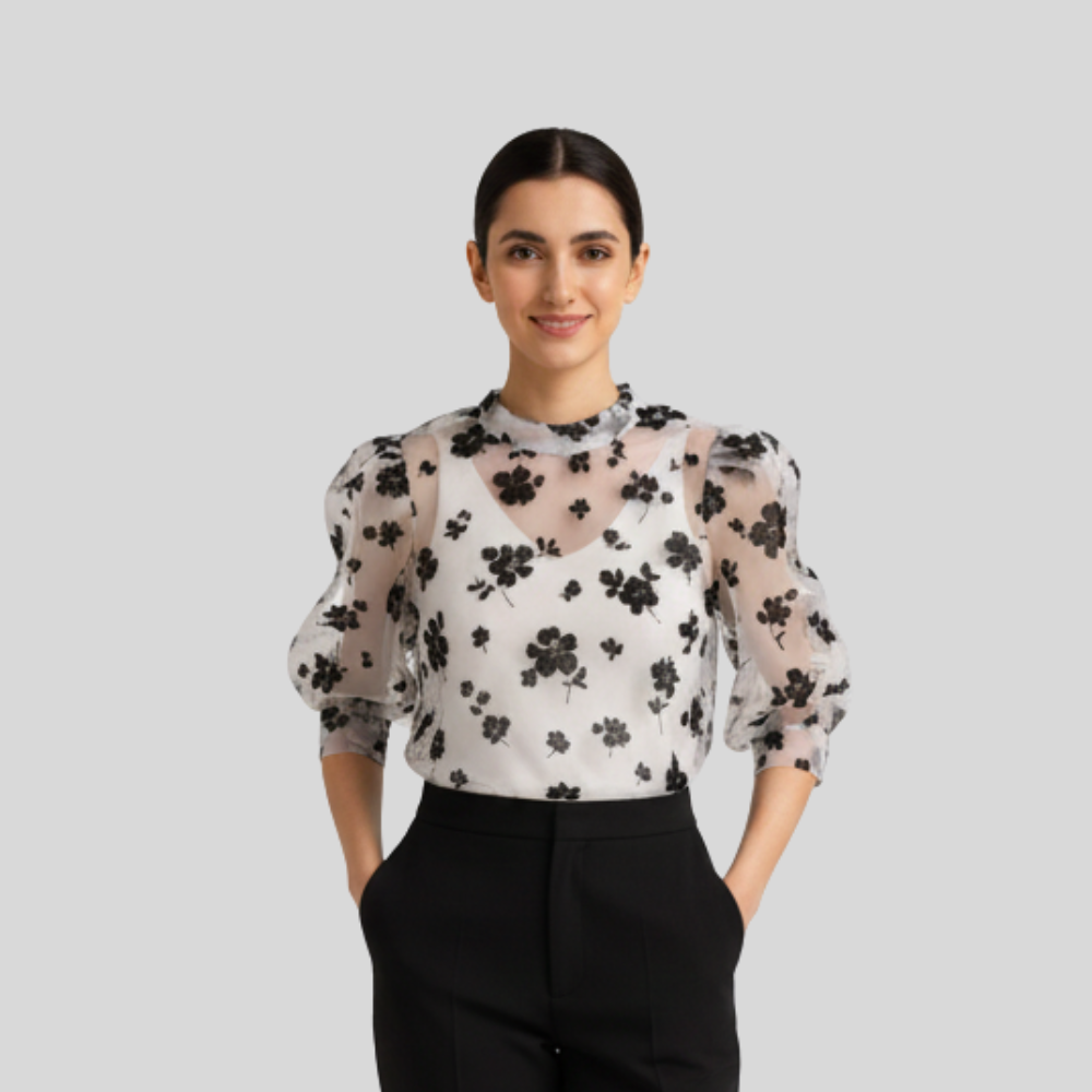 Bring whimsical elegance to your wardrobe with our Dreamy Sheer Floral Top With Puff Sleeves for Women. Designed with delicate floral embroidery over transparent fabric, dramatic puff sleeves, and a cropped silhouette, this top blends dreamy style with modern trends. Perfect for evenings out, concerts, or layering over camisoles for a soft yet striking look. Pair it with high-waisted slacks, denim skirts, or flowy bottoms to balance the top’s romantic vibe. Available now at Jhanvi Fashion with fast delivery across India.
