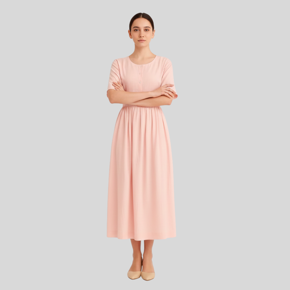 This Dress is the epitome of effortless style. The soft pink color is both feminine and versatile, and the button-down front adds a touch of classic charm. The gathered waist creates a flattering silhouette, and the relaxed fit makes it perfect for everyday wear.