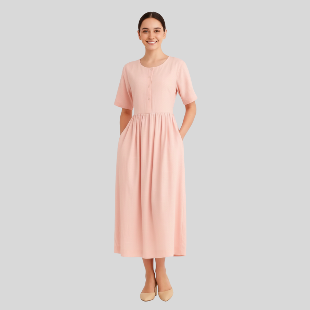 Experience effortless elegance with our Soft Pink Button-Down Dress for Women. Featuring a delicate soft pink hue, a classic button-down front, and a gathered waist that flatters while offering comfort. Short sleeves and a relaxed fit make this dress perfect for everyday wear—pair it with sneakers or sandals for casual days, heels for something special, or layer with a denim jacket for a cooler vibe. Available now at Jhanvi Fashion