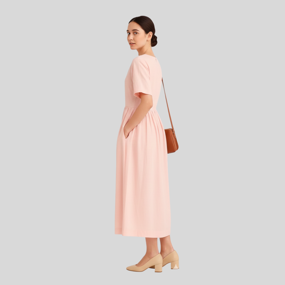 Elegant yet simple. The short sleeves are perfect for warmer weather, and the soft pink hue is just beautiful. It’s become one of my go-to dresses.