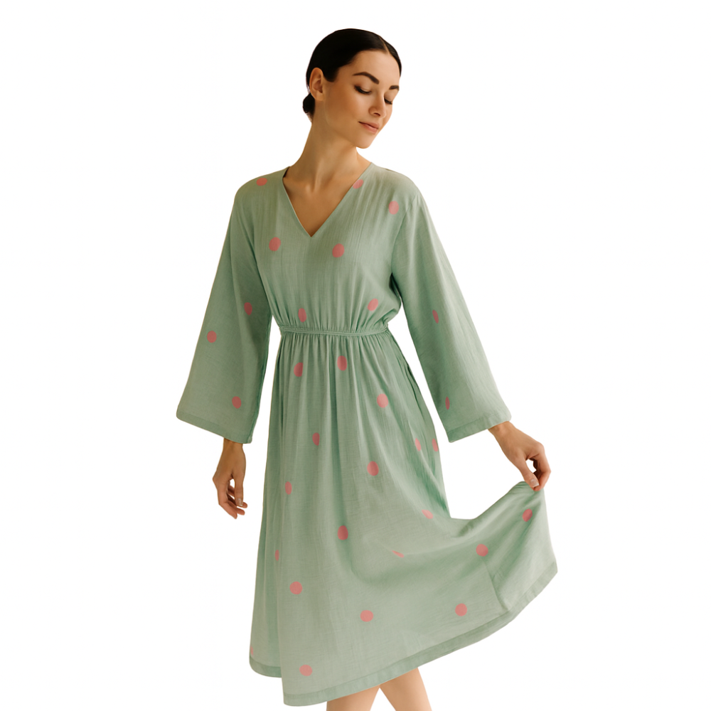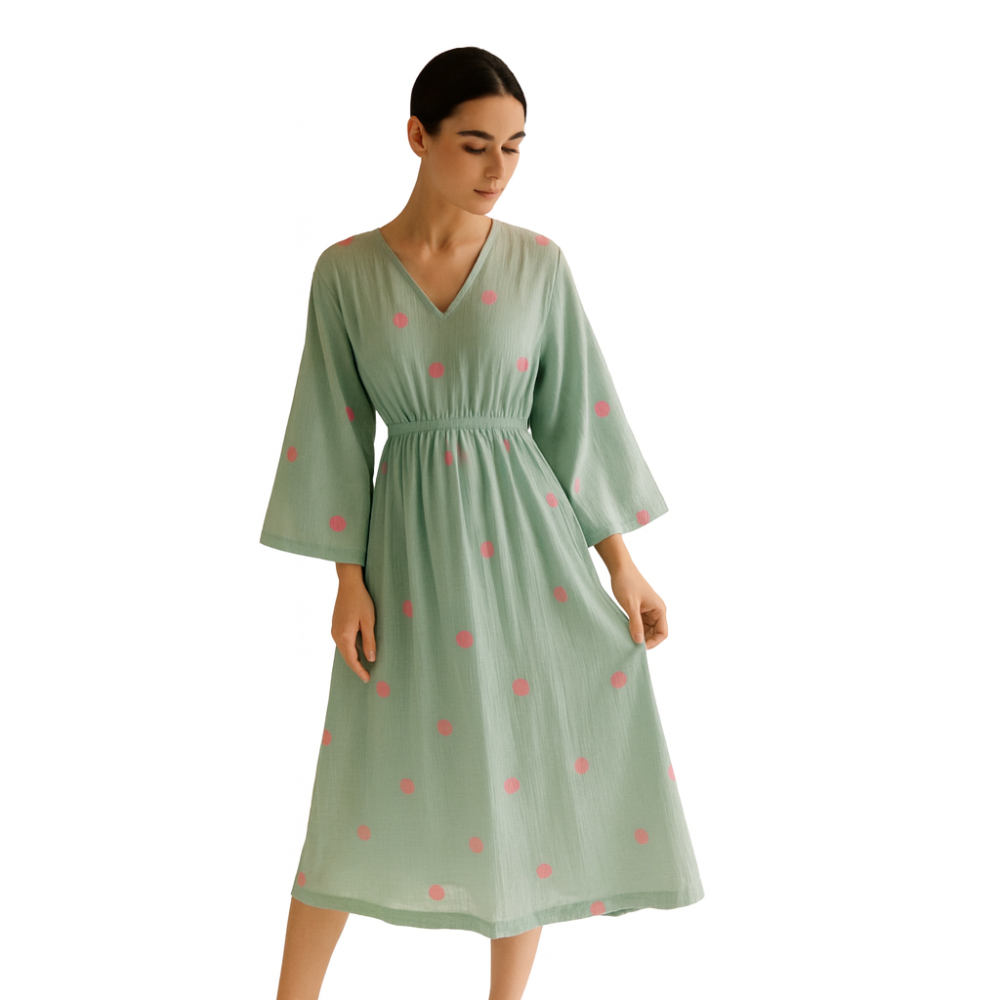 This dress is a perfect blend of comfort and style. The soft light blue color is versatile and easy to pair with any accessories, while the delicate embroidery adds a touch of elegance and personality. The V-neckline and cinched waist create a flattering silhouette, and the three-quarter sleeves with bell cuffs add a touch of femininity.