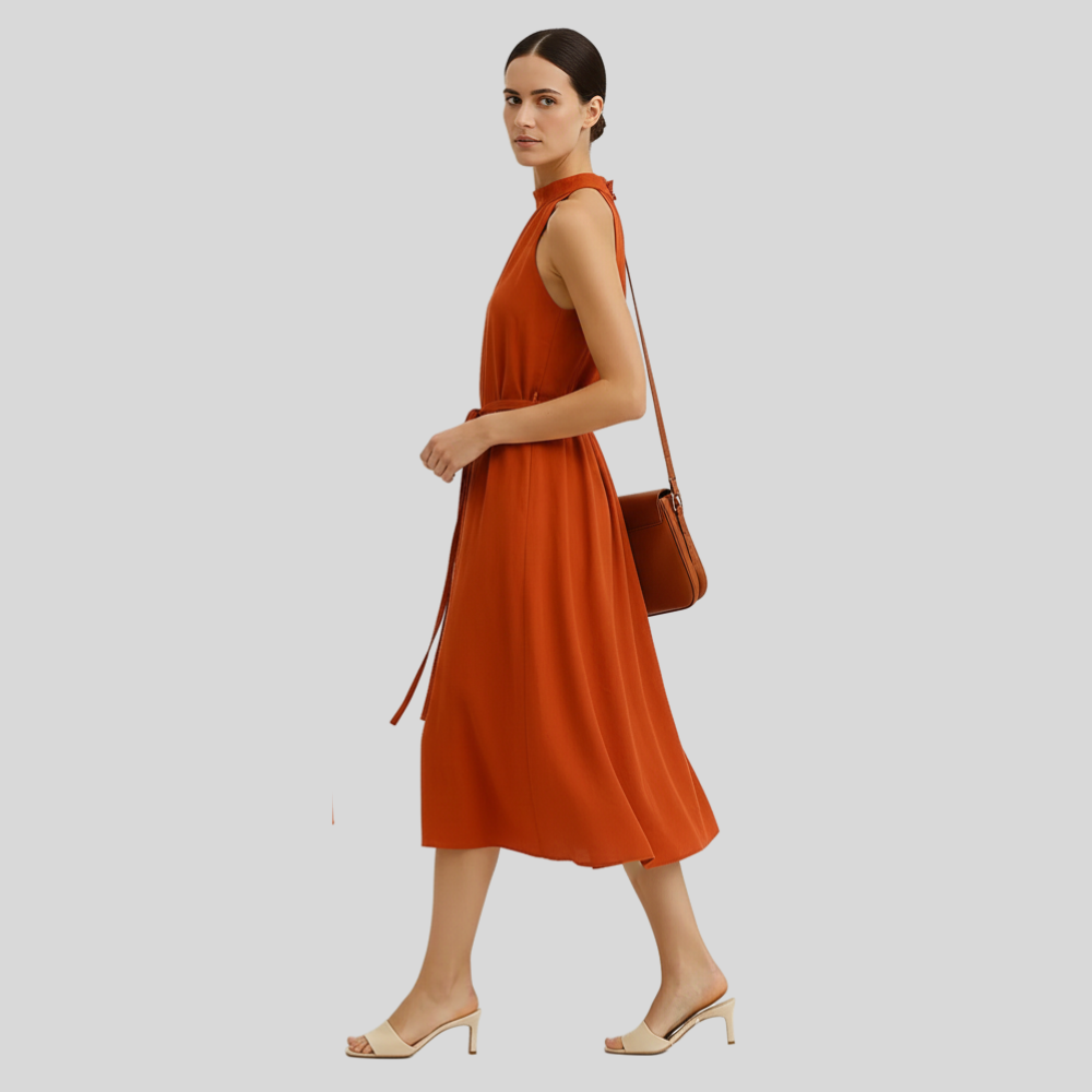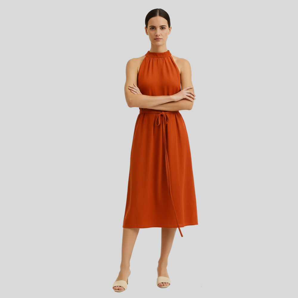 Perfect style paired with comfort-a beautiful orange orange-colored dress and halter neck to give one that sophisticated appeal. The halter neck designs make it attractive along with the flared pleated details, as well as giving room for self-adjustment since it has a drawstring at the waist to create a comfort fit.
