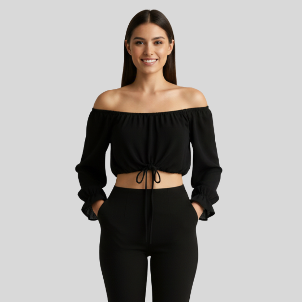 Step into sultry style with our Sheer Black Off-the-Shoulder Crop Top for Women. This top features a delicate sheer fabric with an off-the-shoulder neckline that’s both flirty and sophisticated. Its cropped silhouette adds an edge, making it ideal for party nights, club outings, or bold evening looks. Pair it with high-waisted skirts or jeans, layer with a bralette or camisole underneath for modesty, and add statement accessories to complete the look. Available now at Jhanvi Fashion with fast delivery across India.