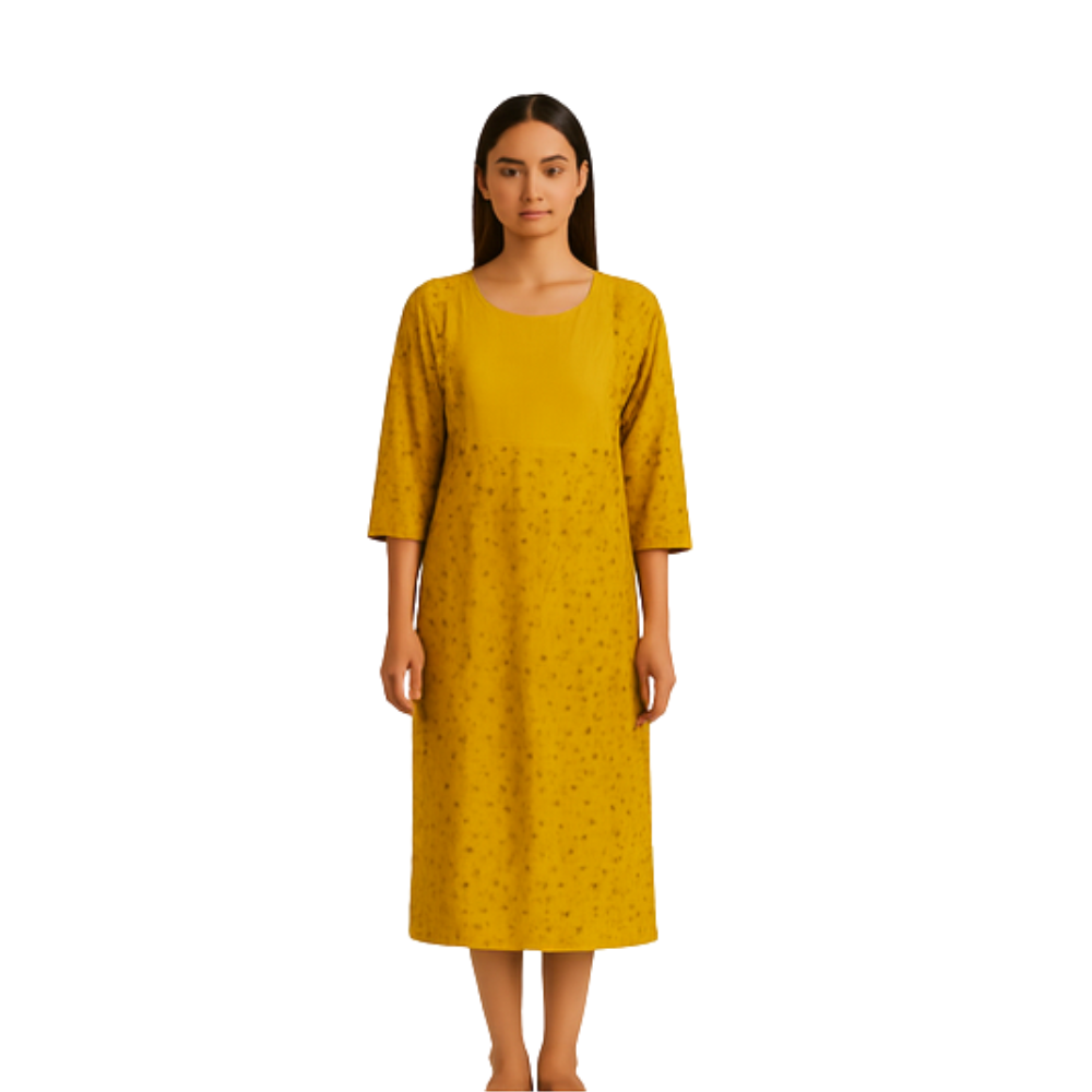 Add sunshine to your wardrobe with our Mustard Yellow Floral Dress for Women. Draped in a warm mustard tone and detailed with a vibrant floral print, this dress exudes effortless elegance. The silhouette is designed to flatter flowing yet structured where it counts (waist, hem, neckline)—making it perfect for summer lunches, evening strolls, or casual outings. Pair it with sandals for comfort or wedges/heels for dressier settings. Available at Jhanvi Fashion.