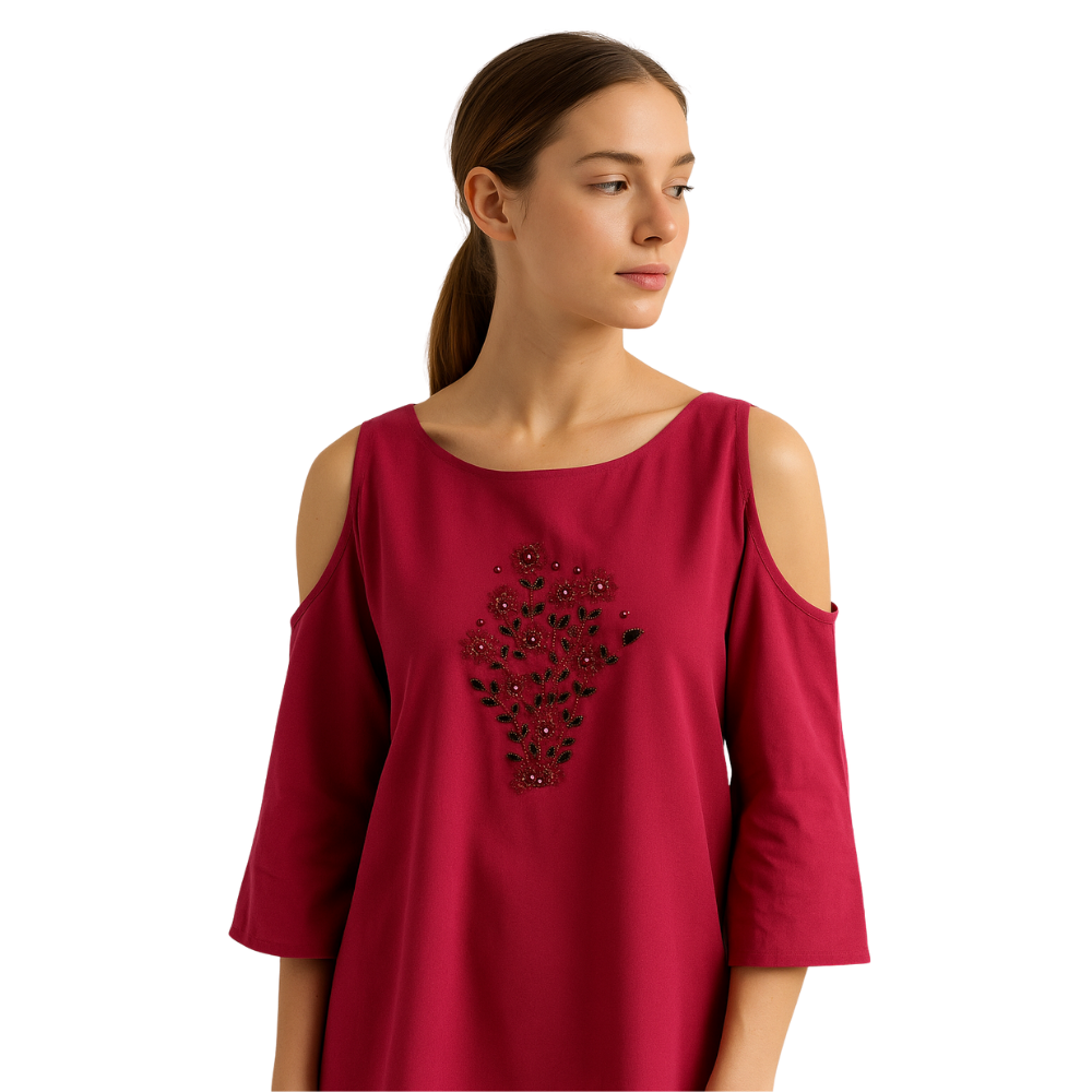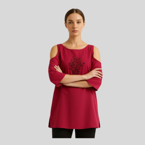 Elevate your outfit with our Pink Embroidered Cold Shoulder Top for Women. Featuring beautiful embroidery and a flattering cold shoulder cut, this top combines bold style with elegance. The vibrant pink color and detailing make it ideal for party nights, dinners, or festive gatherings. Pair it with high-waisted jeans or a skirt for a balanced look, and finish with statement earrings. Shop now at Jhanvi Fashion with fast delivery across India.