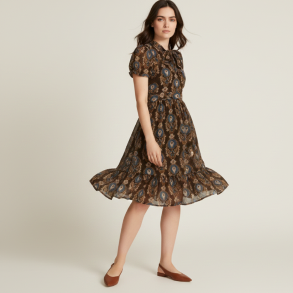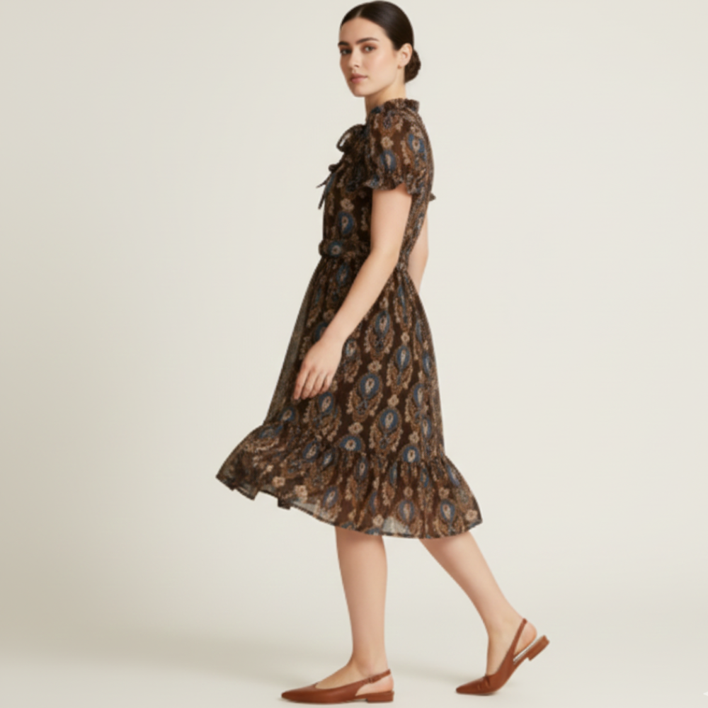 Embrace romantic vintage charm with our Floral Print Brown Dress for Women. Featuring a flowing chiffon fabric and a soft brown floral print, this dress offers sweet ruffled neckline details, short sleeves, a cinched waist with belt, and a tiered skirt that sways beautifully. Ideal for special occasions or day-out looks, you can pair it with ankle boots or sandals for a casual vibe, or heels and accessories for a more dressed-up ensemble. Available now at Jhanvi Fashion