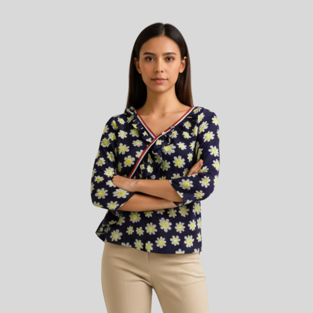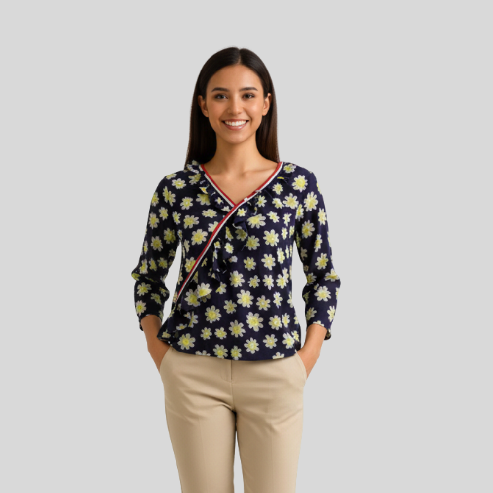 This top is a perfect blend of romance and vintage charm. The dark background is filled with a delicate floral print, which gives the look an elegant and eye-catching appeal. The ruffled details and criss-cross neckline add a touch of femininity and sophistication.