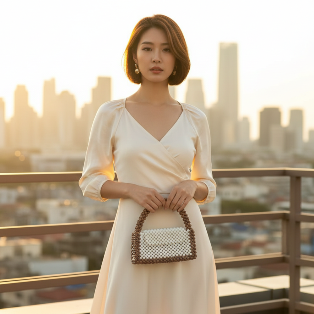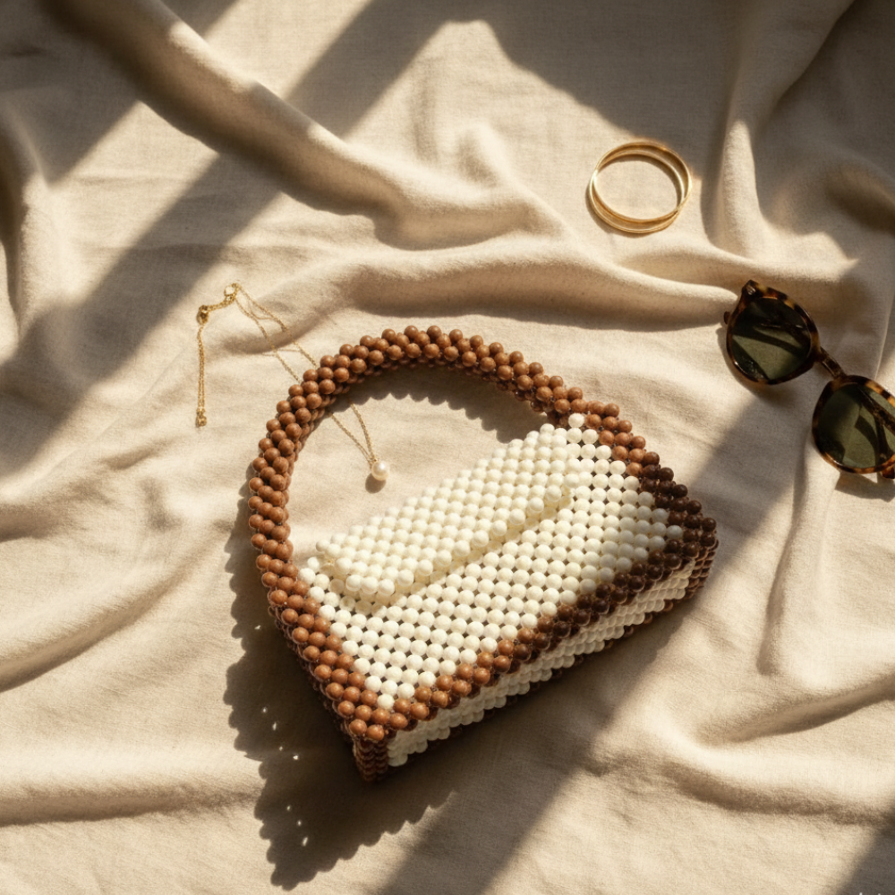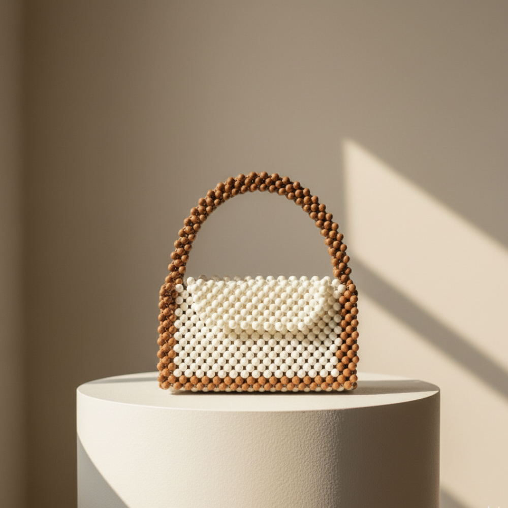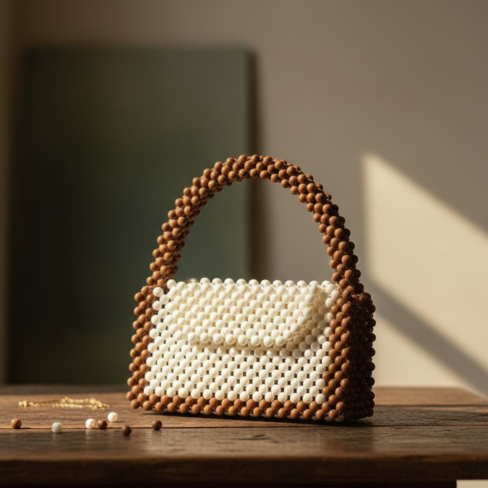 The Ivory Aura Pearl Beaded Mini Handbag is a perfect expression of splendor, craftsmanship, and cutting-edge minimal style. Designed with top rate ivory pearl beads and accented with warmness brown timber beads, this handbag brings a elegant but earthy attraction that enhances every outfit results.