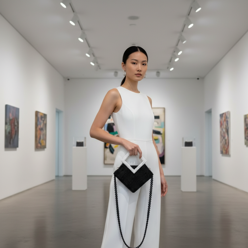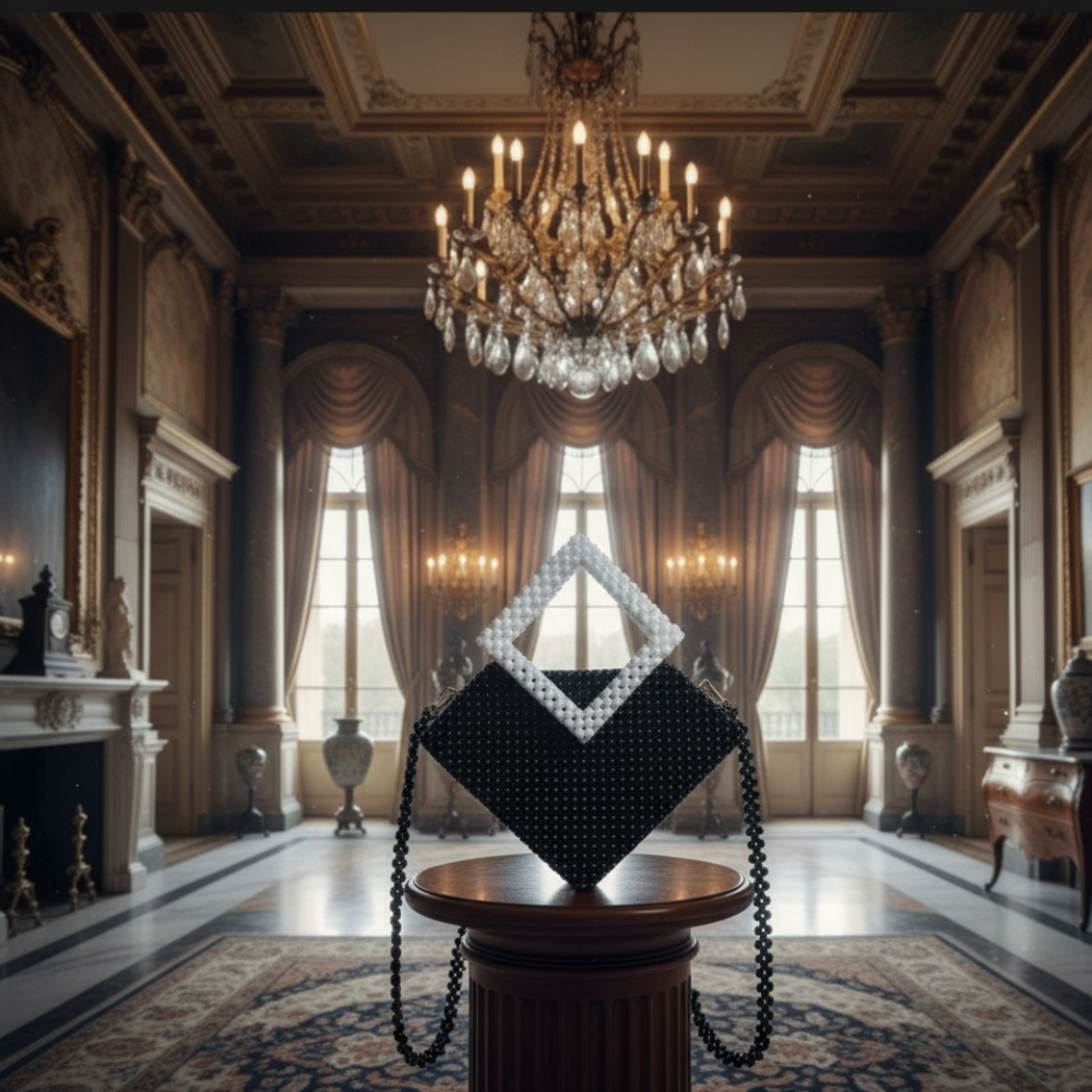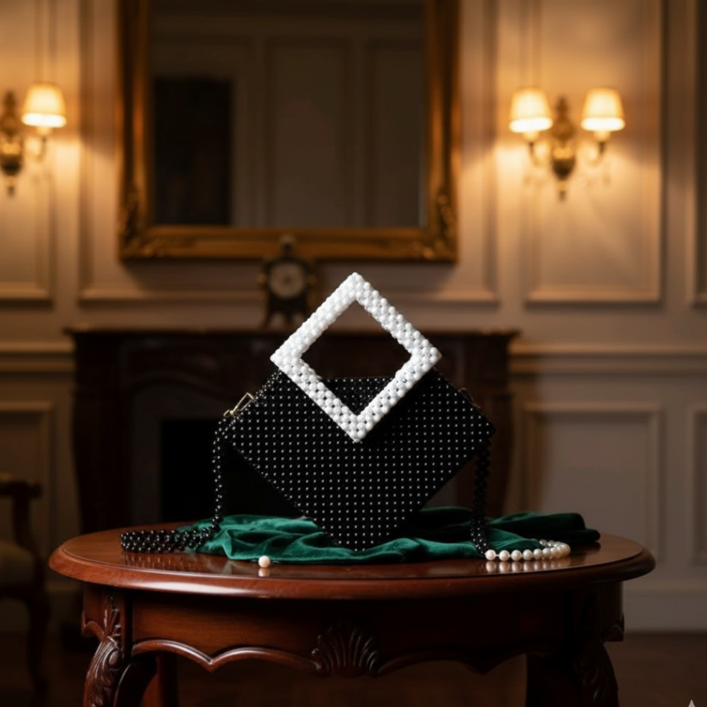 The Luxury Black Beaded Handbagis a real illustration of timeless luxurious and modern-day layout. Crafted with pinnacle magnificence black beads and highlighted through using a hanging white geometric take care of, this handbag gives a bold but elegant assessment that at once elevates your outfit. Its diamond-stimulated based form shows delicate craftsmanship and high-style aesthetics.