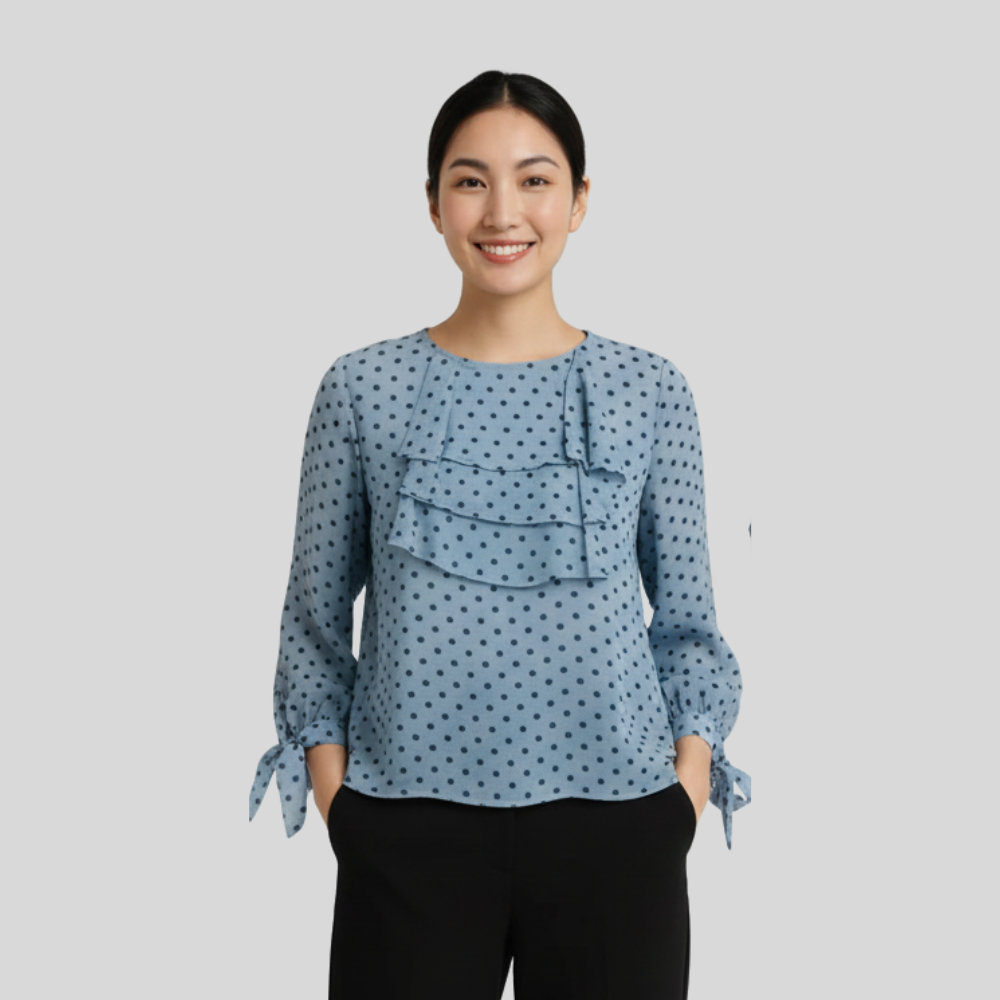 Let joy pop in your style with the Playful Polka Dot Top for Women. Featuring small dark dots on a soft light blue base, plus charming ruffles at the neckline and cuffs, this top adds femininity and fun. Made with breathable fabric to keep you comfy all day, it pairs beautifully with jeans, skirts, or shorts. Perfect for spring outings, casual meetups or layering under jackets for cooler evenings. Available now at Jhanvi Fashion, with free delivery across India.