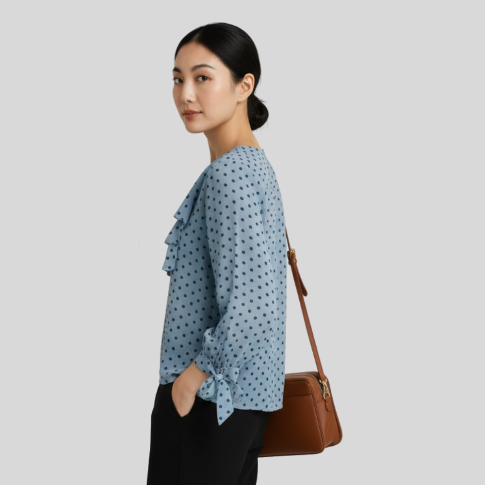 This top is a spring bursting forth with its cheerful polka dots and playful design. The small dark dots on a light blue background are literally eye-catching in a cheerful manner. The details added to the neckline and cuffs come with a feminine and sophisticated twist.