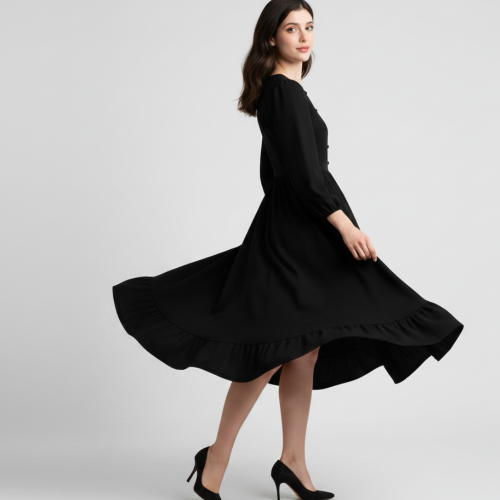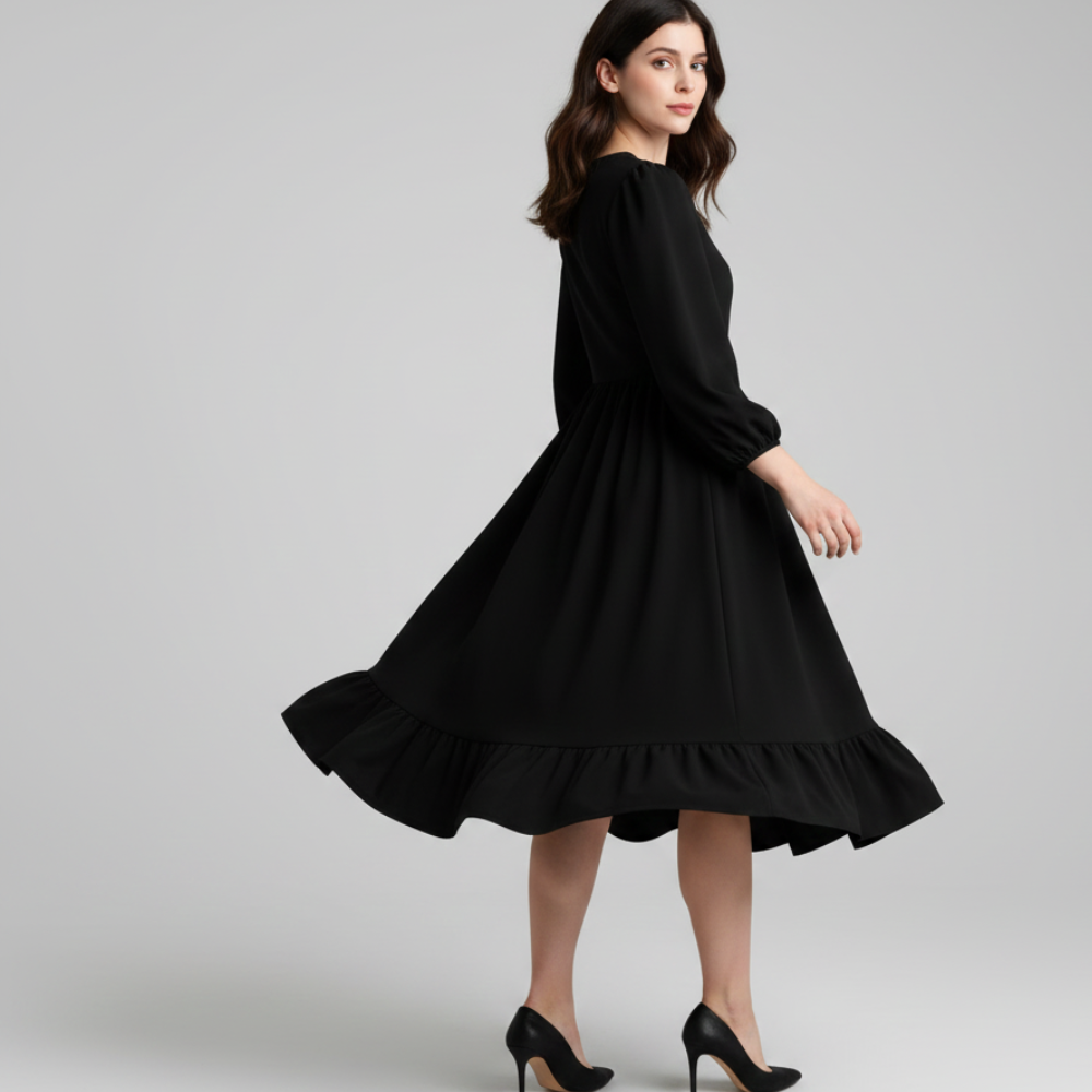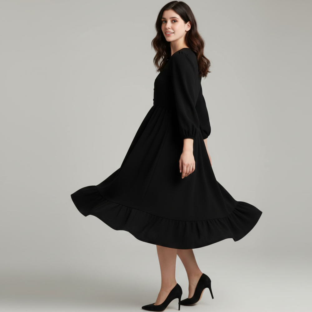 This dress is a charming blend of vintage style and modern elegance. The deep black color is both sophisticated and versatile, while the ruffled neckline and sleeves add a touch of femininity and playfulness. The cinched waist and ruffled hemline create a flattering silhouette that is both romantic and eye-catching.