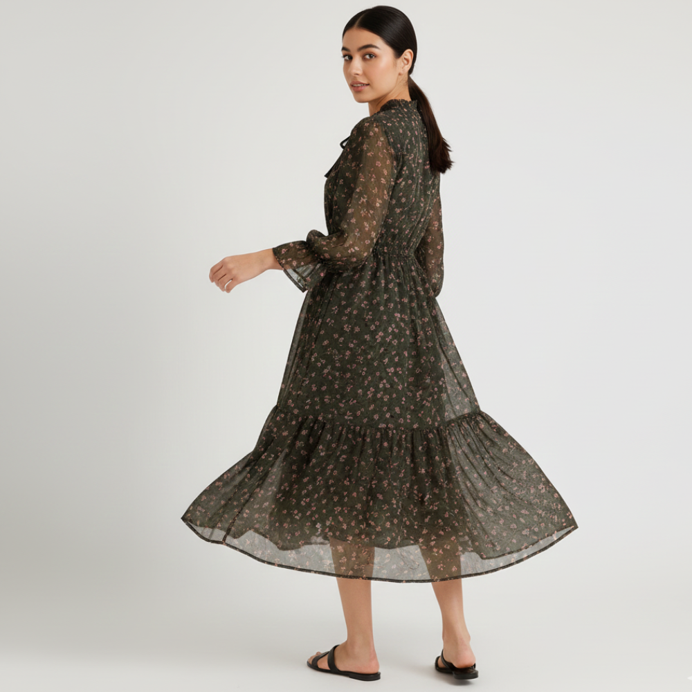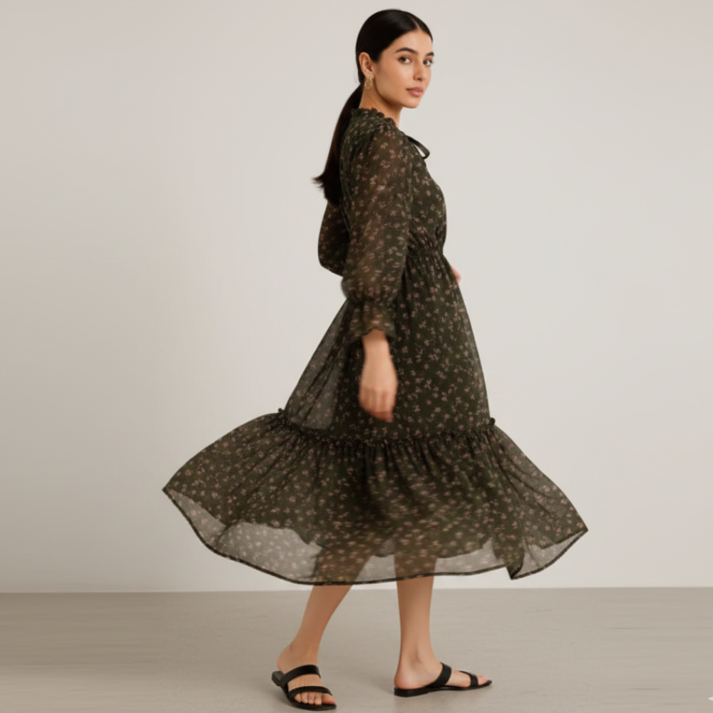 Elegant and comfortable. The dress fits perfectly and moves gracefully. The puff sleeves add a feminine touch, and the floral print is timeless. I love pairing it with sandals for a laid-back look