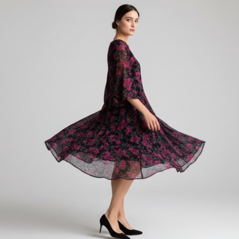 Bring a nostalgic charm into your wardrobe with our Romantic Floral Dress With a Vintage Flair. Made from light, flowing chiffon in a classic black flower motif, this dress features a ruffled neckline, belted waist, three-quarter sleeves, and a tiered skirt that sways gracefully. Whether you’re out for a romantic dinner or a day in town, its vintage-inspired style adds elegance and softness to any look. Pair with ankle boots or heels for an evening touch, or dress it down with sandals. Free delivery across India with purchase at Jhanvi Fashion.