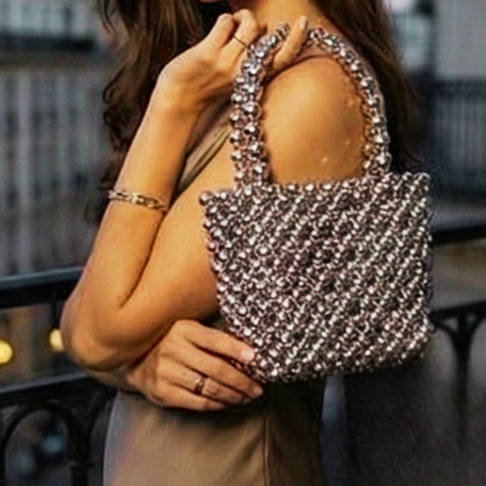 Make a formidable style declaration with the Silver Luxe Beaded Mini Handbag, a extraordinary accessory crafted for girls who love glamour, shine, and iconic designer-stimulated quantities. Crafted from pinnacle rate mirror-finish metallic beads, this handbag provides a stunning reflective sparkle that instantly turns heads at any event. Its based shape keeps a smooth, polished silhouette while nonetheless being light-weight and relaxed to maintain.