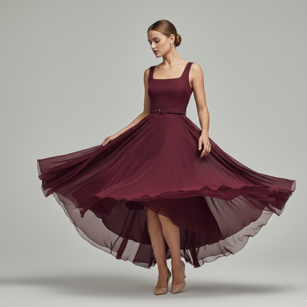 This dress is a gem! The maroon shade is rich and perfect for so many occasions. The waist-tie flatters, and the asymmetrical hem adds a stylish twist. I felt chic all day long