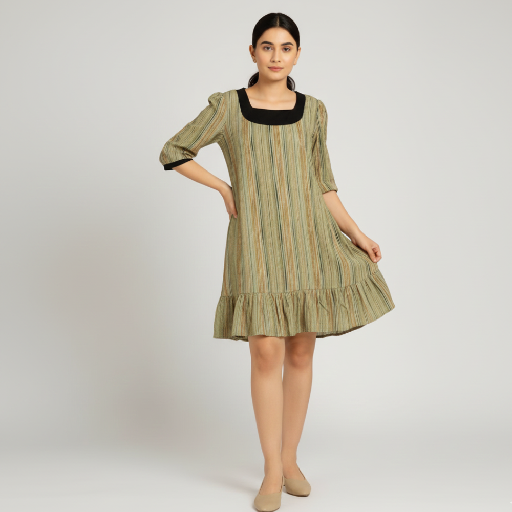 Make a statement with our Trendy And Unique Layered Dress With Puff Sleeves. Featuring contrasting black top and vibrant multi-colored striped layers, this dress balances bold style and feminine flair. Puff sleeves add volume, while the ruffled hemline brings playful movement with every step. Crafted from breathable, comfortable fabric, it’s ideal for casual day outings, relaxed summer events, or styling with flats or heels. Stand out comfortably—now available at Jhanvi Fashion